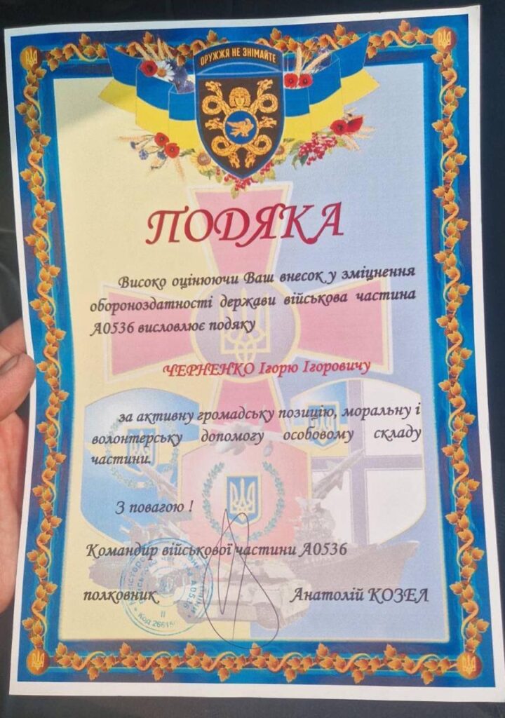 Відповідно, командування військової частини висловлює щиру подяку Ігорю Черненко за волонтерську допомогу.